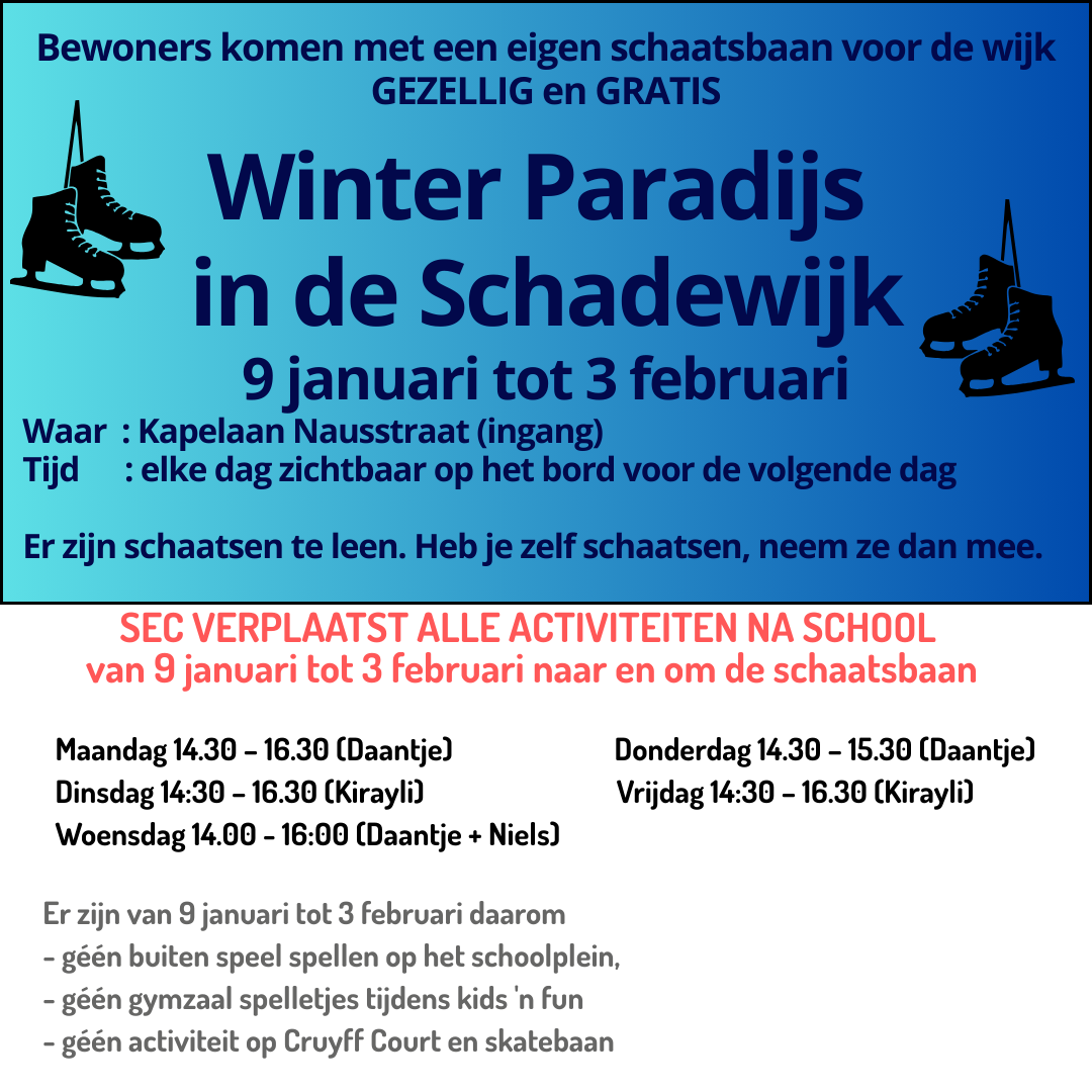 Schaatsen voor kinderen zijn aanwezig dus kom gezellig langs. Op naar nog meer winterpret in de wijk!