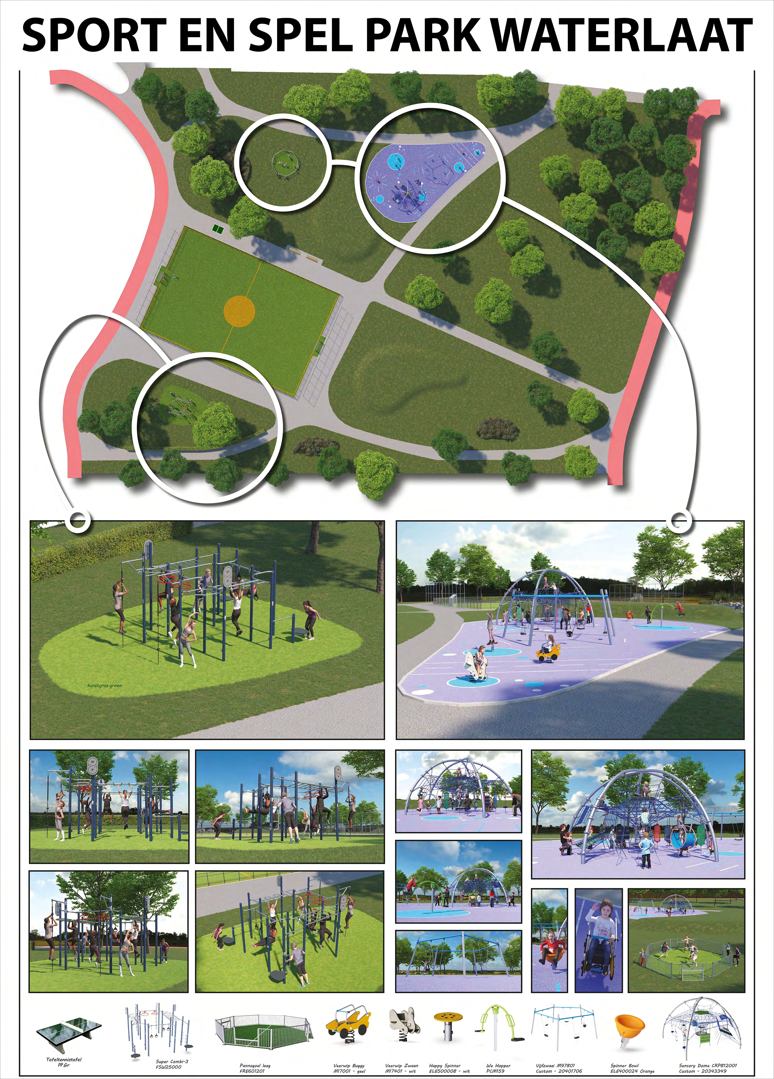 Op de tweede poster zie je een voorlopig ontwerp van diverse speeltoestellen. Dit najaar zal er een definitief ontwerp volgen op basis van de laatste ideeën die bewoners hebben gedeeld. Hopelijk zullen deze toestellen dan in het voorjaar geplaatst kunnen worden.